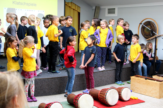 Dann folgten interessante Kurzvorträge der Klasse 4b über den Ursprung sowie die Geschichte der fünf ältesten Spiele "Würfeln", "Bingo", "Mikado", "Karten-" und "Schlangenspiel". Wer sich nicht alles merken konnte, hatte in den nächsten Pausen Gelegenheit, alles Gehörte noch einmal an den Klapptafeln im Schulhof in Ruhe nachzulesen. Die anschließende Frage von Rektorin Petra Henz nach aktuellen Gesellschaftsspielen konnten die Kinder natürlich leicht beantworten, weshalb alle Klassen als Preis jeweils eine Packung "Schokoladenmikado" überreicht bekamen. Jetzt war es wieder an der Zeit für etwas Bewegung und so brachten die Klassen 2a und 2b das Publikum mit den beiden Klatschspielen "Boom Snap Clap" und "Schokolade" auf Trab. Nach einer gekonnten Vorführung sowie einer kurzen Erklärung der Choreographie hielt es die Zuschauer nicht länger auf ihren Plätzen und so bebte die Aula unter dem rhythmischen Klatschen.