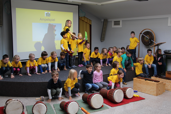 Nun stellten die beiden 1. Klassen das Ampelspiel vor, das sich problemlos für kurze Bewegungspausen im Unterricht eignet, von der Schulgemeinschaft sofort begeistert ausprobiert wurde und in Zukunft zwischendurch immer mal gespielt werden kann.