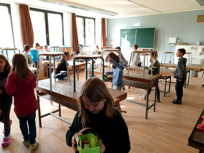 Nachdem zur Einstimmung auf Ostern schon gemeinsam Ostergras gepflanzt wurde, schlichen die Kinder nun ganze leise durch das Schulhaus, um den Osterhasen nicht zu verscheuchen. Gesucht wurden die eigens im Fach Werken und Gestalten herge-stellten Osternester aus buntem Tonpapier, die der Osterhase zuvor liebevoll befüllt und versteckt hatte. Mit vollem Körpereinsatz, einer ordentlichen Portion Aufregung und viel Freude spähten die Kinder in alle Ecken und Verstecke.