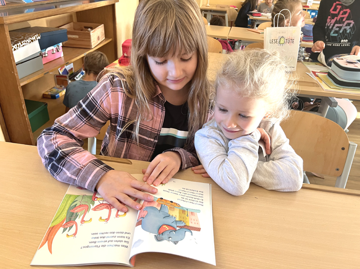 Anschließend hatten die Schülerinnen und Schüler noch Gelegenheit, sich in den Klassenzimmern gegenseitig vorzulesen. Die Drittklässler nahmen sich gleich das neue Buch zur Hand, die „Kleinen“ lauschten aufmerksam. Danach wurden die Rollen getauscht und die Erstklässler durften ihren Paten zeigen, dass auch sie schon einige Buchstaben gelernt haben und erste Wörter lesen können!