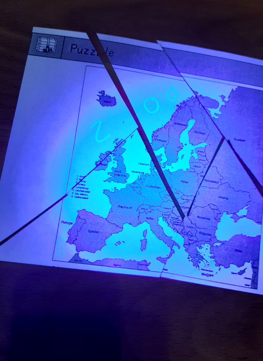 Intrinsisch motiviert gingen die Schülerinnen und Schüler an die Aufgabe heran. Das Tablet war dabei sehr hilfreich, galt es doch ein schwieriges Kreuzworträtsel zu lösen. Über einen QR Code-Scan gelangte man zu einem Wissensquiz über Nachbarländer oder Länder in Europa und deren Hauptstädte. Viele weitere Gegenstände dienten der Ergänzung: eine Europakarte, ein Wörterbuch und eine geheimnisvolle UV-Taschenlampe. „Das beste war die Taschenlampe, und dass ich darauf gekommen bin, wie man sie benutzt“, reflektierte ein Schüler im Anschluss, der es schaffte, den unsichtbaren Code durch das UV-Licht sichtbar werden zu lassen. Hatte man als kleines Team das erste Schloss geöffnet, durfte man den STOPP-Umschlag aufmachen. Hier gab es weitere kniffelige Aufgaben zu lösen, so dass schnelle wie auch langsame Tüfftler voll auf ihre Kosten kamen. Groß war die Freude und Begeisterung, als die Kiste am Ende der Stunde geöffnet wurde – und eines steht fest: „Zum Ende des Schuljahres müssen wir so etwas Cooles unbedingt noch einmal machen!“ – Versprochen!