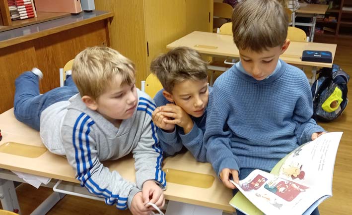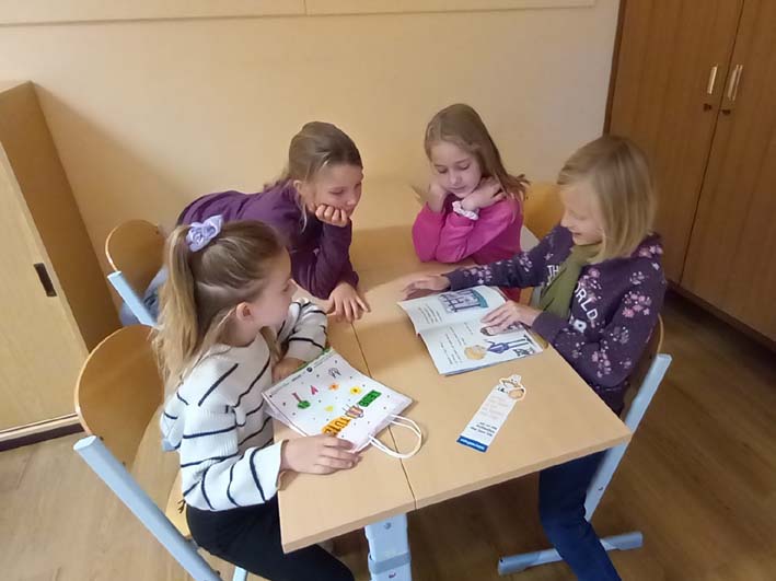 Zunächst besprach Michelle Ganter mit den Kindern, warum Lesen zu können etwas Tolles ist, wo man Lesestoff für die neu erworbene Fähigkeit bekommt und was der Unterschied zwischen einer Buchhandlung und einer Bücherei ist. Anschließend suchten sich die Paten mit ihren Patenkindern Plätze in der Schulbibliothek oder den Klassenzimmern und lasen ihnen aus dem neuen Buch vor.