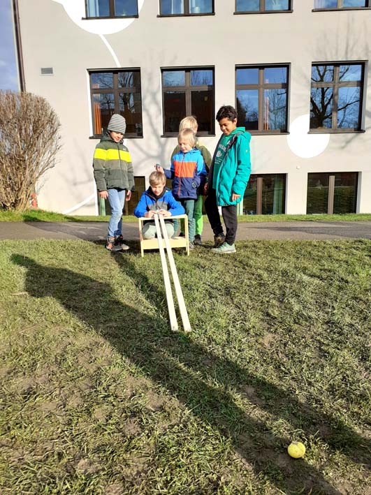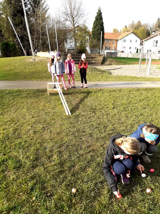 Dann ging das gemeinsame Suchen los! Manches war ganz leicht versteckt, bei anderem brauchte es viel Einfallsreichtum oder auch Teamwork um das Gefundene zu bergen. Als die Verstecke geleert und das gemeinsame Sammel-Osternest gefüllt war, ging es an die Brauchtumspflege: an mehreren Stationen versuchten die Schülerinnen und Schüler ihre mitgebrachten Cent zu vermehren, indem sie beim „Oarschiem“ durch geschicktes Herunterkullern des eigenen Eies versuchten, die gefärbten Eier der Mitspieler anzustoßen und so den darauf platzierten Cent herunterfallen zu lassen.