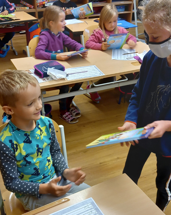 Um bei unseren Erstklässlern die Freude aufs Lesenlernen zu steigern, haben die Drittklässler im Namen aller Schüler durch ein Buchgeschenk die neuen Schulanfänger darauf eingestimmt.