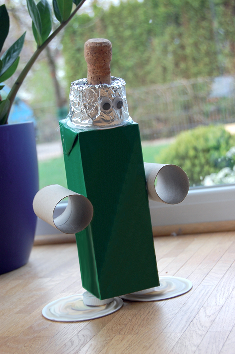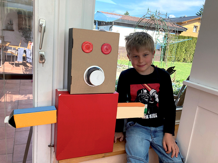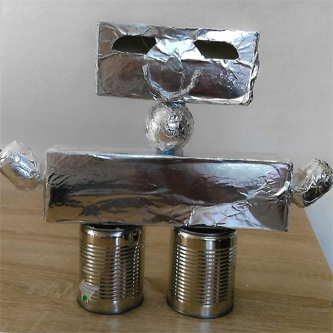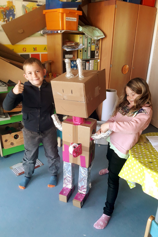 Im Rahmen des Homeschoolings erhielten sie den Auftrag, Material zu sammeln, das diesen Körperformen entspricht und daraus einen Roboter zu basteln. Hier sehen Sie eine kleine Auswahl.
