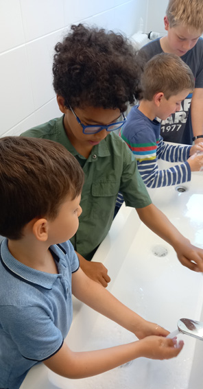 Nach dem bewährten Sozialformenprinzip „Kleine lernen von Großen“ erforschten die Drittklässler zunächst alleine die Notwendigkeit und die Grundlagen des richtigen Händewaschens.