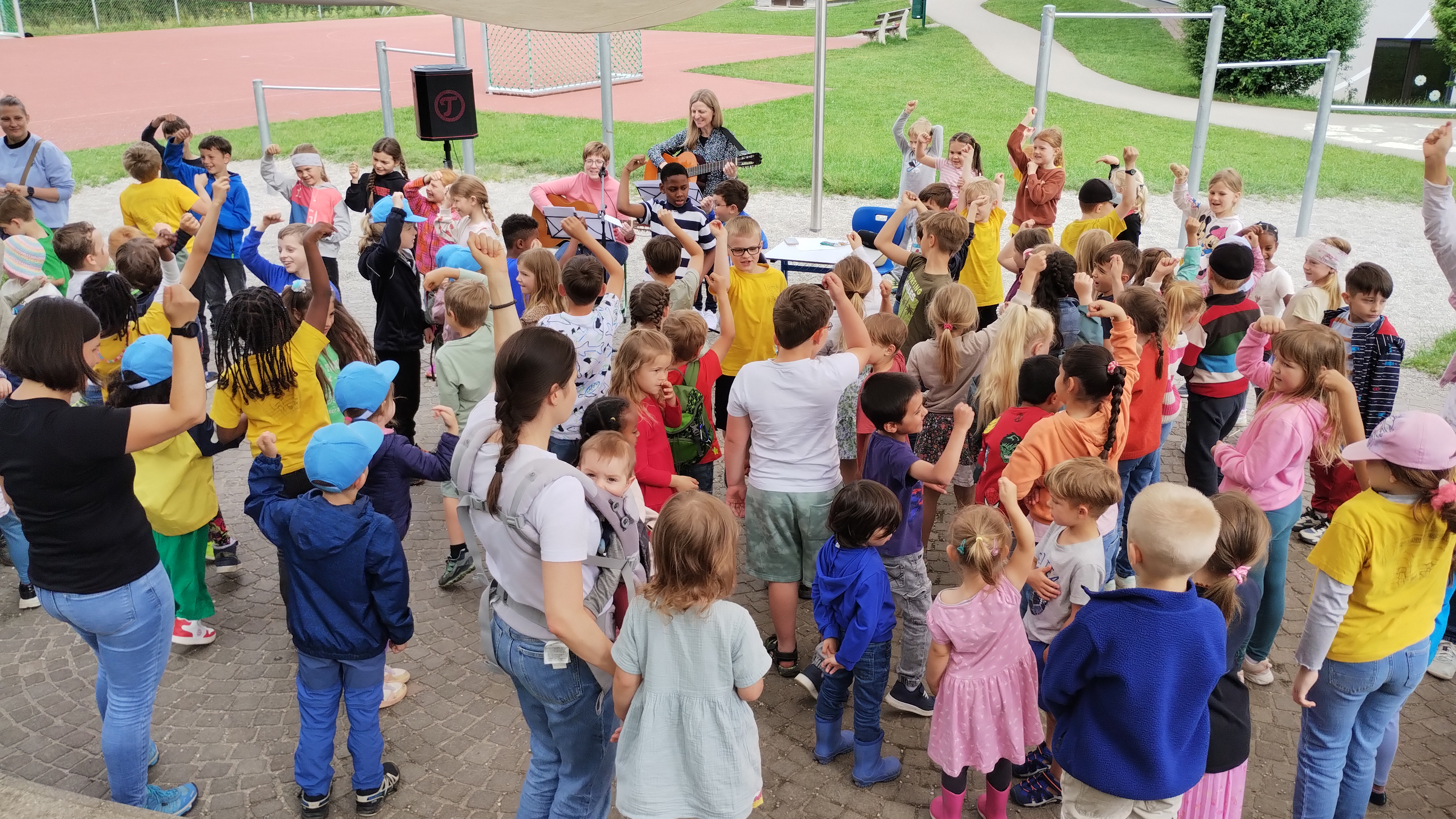 Der bayernweite Tag der Musik stand in diesem Jahr unter dem Motto: Singen wir gemeinsam. Dazu lud die Grundschule Bernau am Donnerstag, den 5. Juni 2025 die zukünftigen Erstklässler aus allen Kindergärten ein, um mit den Klassen 1a, 1b und 2a zu singen, zu tanzen und Musik als ein freudiges und verbindendes Ereignis zu erleben. So füllte sich an diesem Tag unser großes Amphitheater im Pausenhof wieder mit 135 musikbegeisterten Kindern. Begleitet wurden die Lieder auf den Gitarren von den beiden Lehrerinnen Monika Kronast und Christina Mroczeck von Gliczinski. Nach dem vielen Singen gab es für jeden Teilnehmer eine Mini-Breze zur großen Freude der Kinder und mit bestem Dank an den Elternbeirat der Grundschule.
