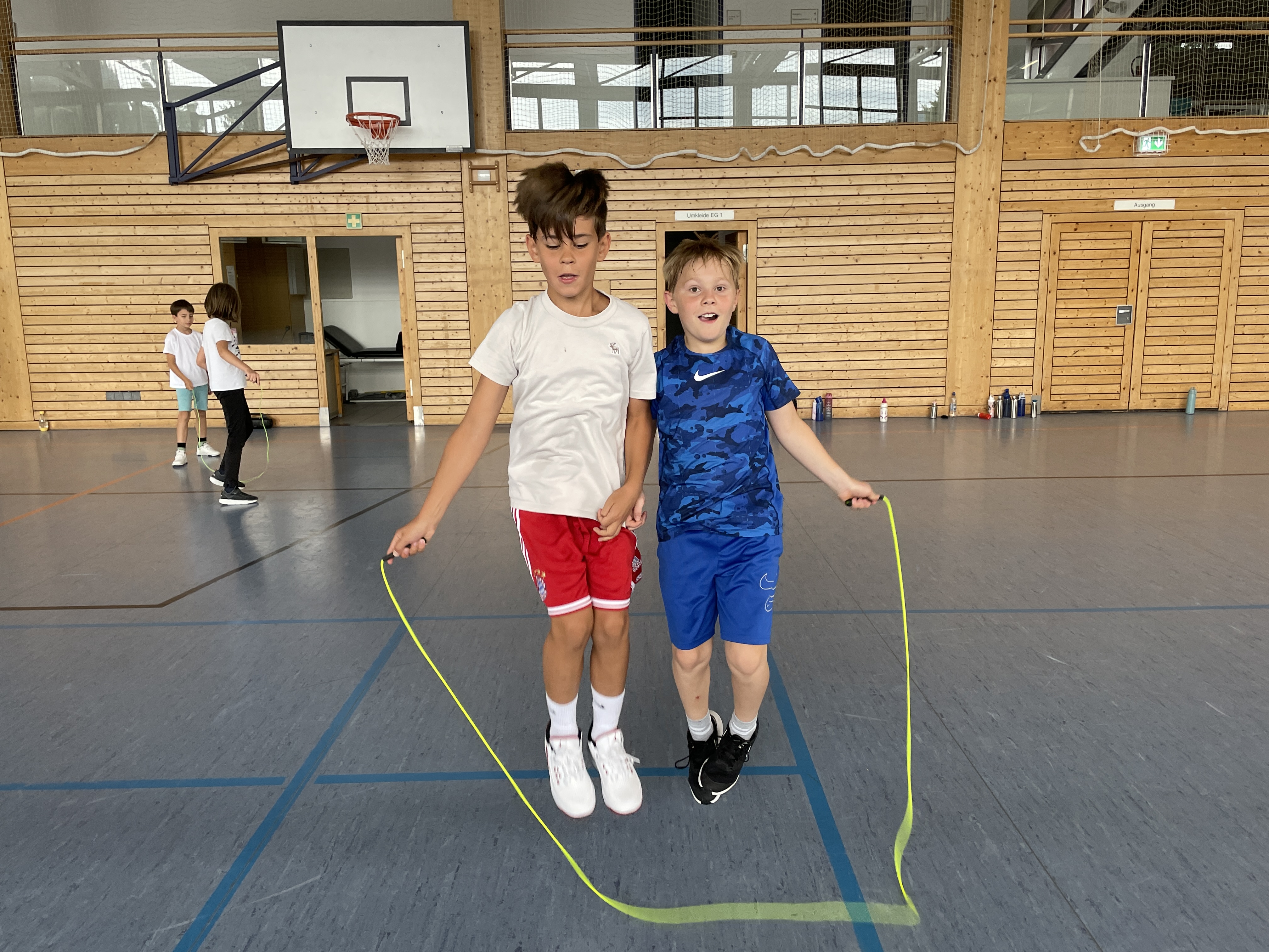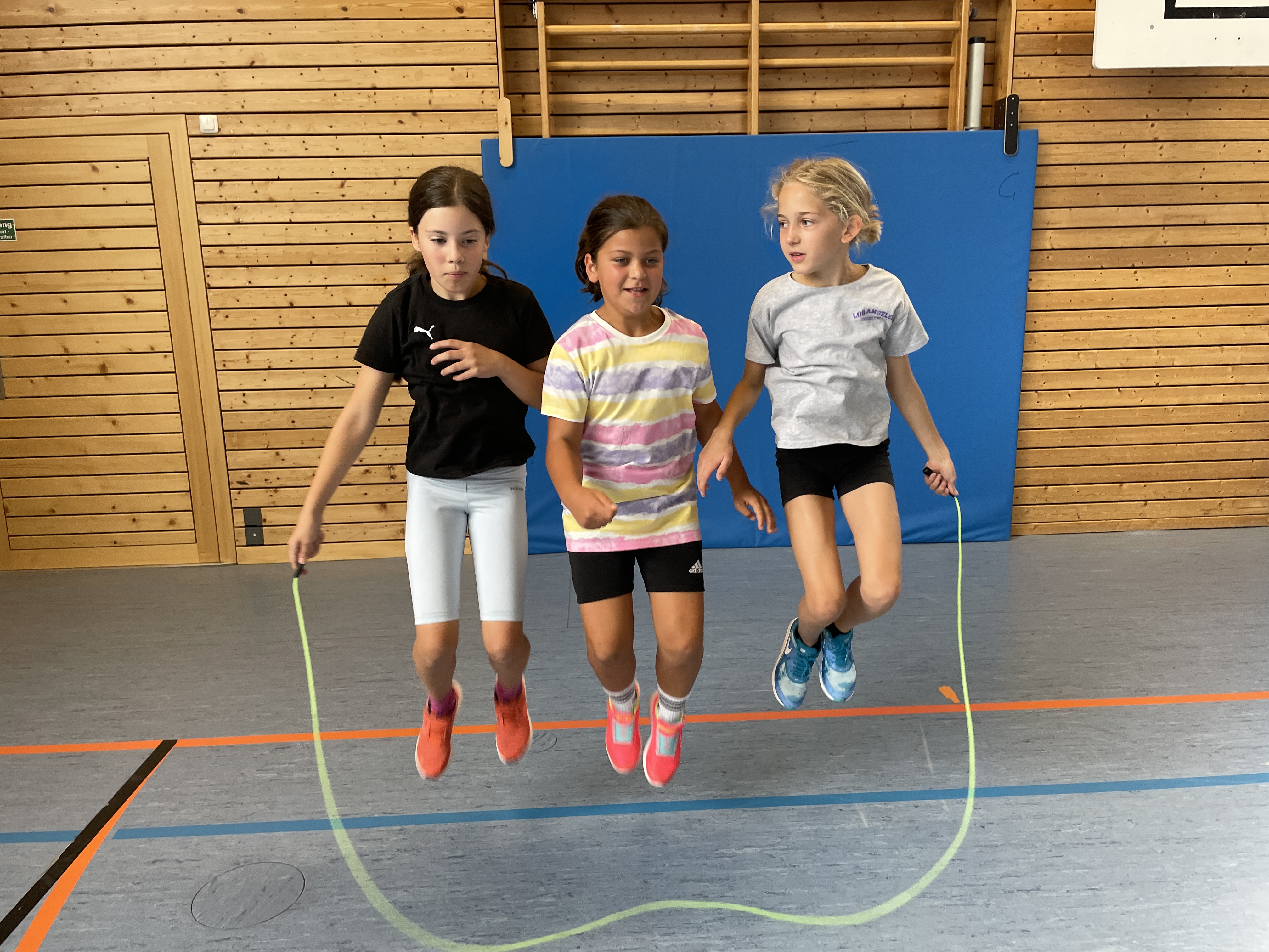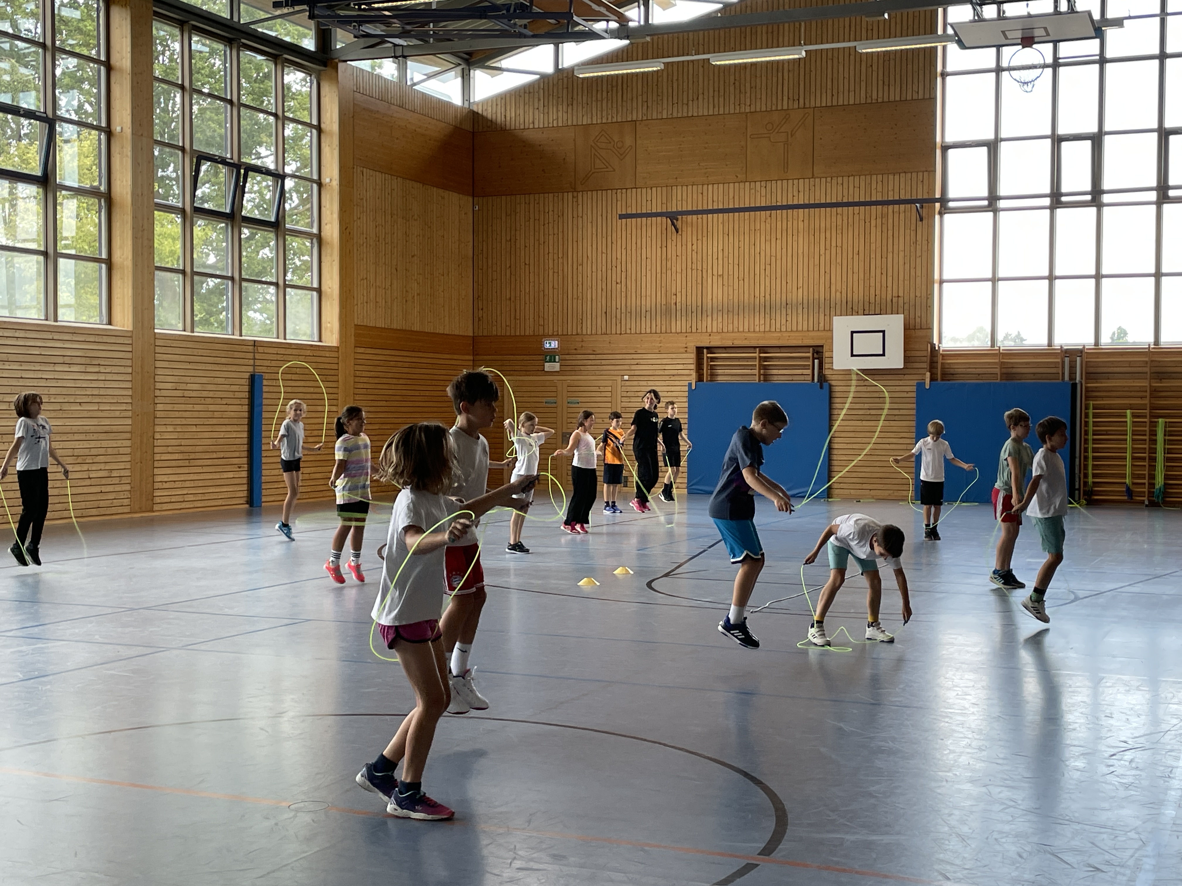 Die sportliche Form des Seilspringens „Skipping hearts“ eignet sich zur Schulung und Verbesserung motorischer Grundfähigkeiten wie Ausdauer und Koordination. Durch die Teamarbeit wird die Integration aller Kinder vorangebracht. Die Erfolgserlebnisse beim Springen motivieren und erhöhen die Freude an der Bewegung. Ganze 3 Stunden waren die Kinder zugange, Einzel-, Partner- und Teamsprünge einzuüben und in einer Präsentation im Anschluss vorzuführen . Ein tolles Bild am Ende, die eingeladenen Kindergartenkinder, Zweitklassler zusammen mit den „Profis“, den Viertklasslern Seilspringen zu sehen.