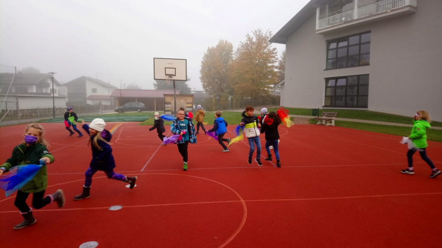 Die Kinder bauten aus Jongliertüchern und einem Tennisball bunte Geister, welche im nebeligen Morgen zum Fliegen gebracht wurden.