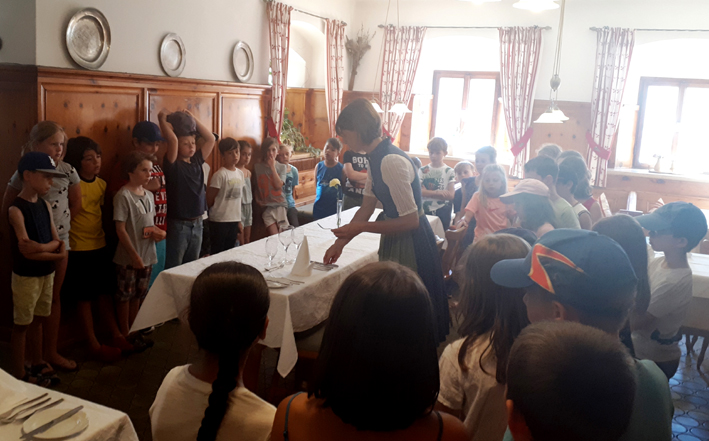 Vor den Pfingstferien hatten wir den Ernährungsführerschein in HSU gemacht. Dafür lernten wir viele Sachen über die richtige Ernährung und natürlich auch, wie man leckere Gericht kocht und herstellt. Weil in diesem Schuljahr unser Motto "Benimm ist in" ist, hatten wir die Idee, unsere Patenkinder einzuladen und für sie zu kochen. Dazu gehört natürlich auch ein richtig gedeckter Tisch. Aber wie macht man das? Also haben wir uns professionelle Unterstützung geholt: Frau Stolz vom Alten Wirt in Bernau war bereit, uns zu zeigen, wie man einen Esstisch richtig vorbereitet.