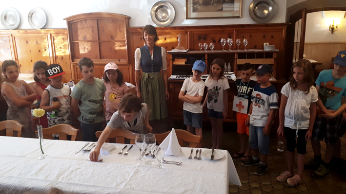Sie empfing uns schon im Speisesaal. Außerdem standen schon Tische mit Gläsern, Besteck, Tellern und Servietten bereit. Nun ging es los: Der Tisch sollte richtig gedeckt werden. Aber oh je – so viele verschiedene Messer, Gabeln und Löffel! Wo legt man was hin?