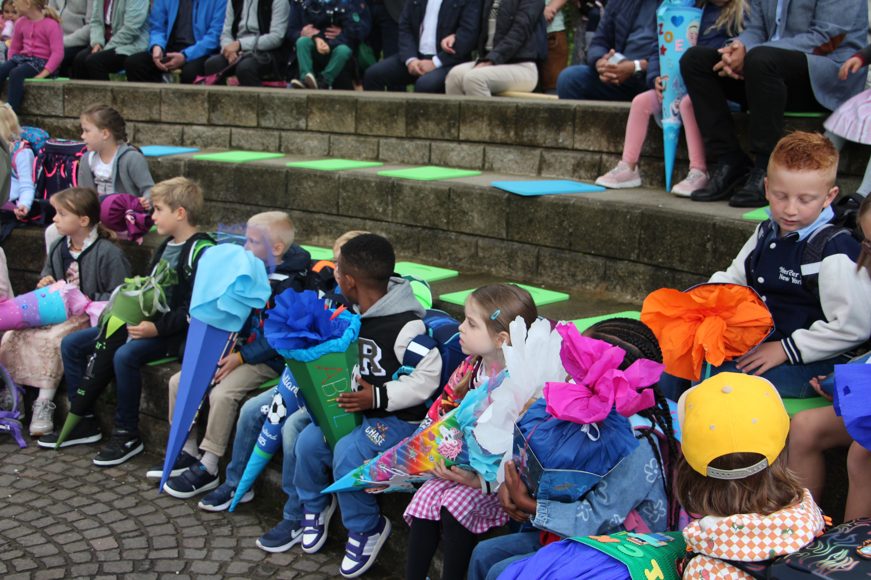 Rektorin Petra Henz und Konrektorin Petra Matthes begrüßten die Erstklassler, zahlreiche Eltern, Verwandte und Freunde im Amphitheater der Schule. Die „Großen“ eröffneten unter der Leitung von Petra Matthes mit dem Bernauer Schullied „In Bernau gibt`s a Grundschui…“ traditionell die Feier und da ein Erstklassler genau an seinem 1. Schultag Geburtstag hatte, gab es von der versammelten Schulfamilie ein Geburtstagsständchen.