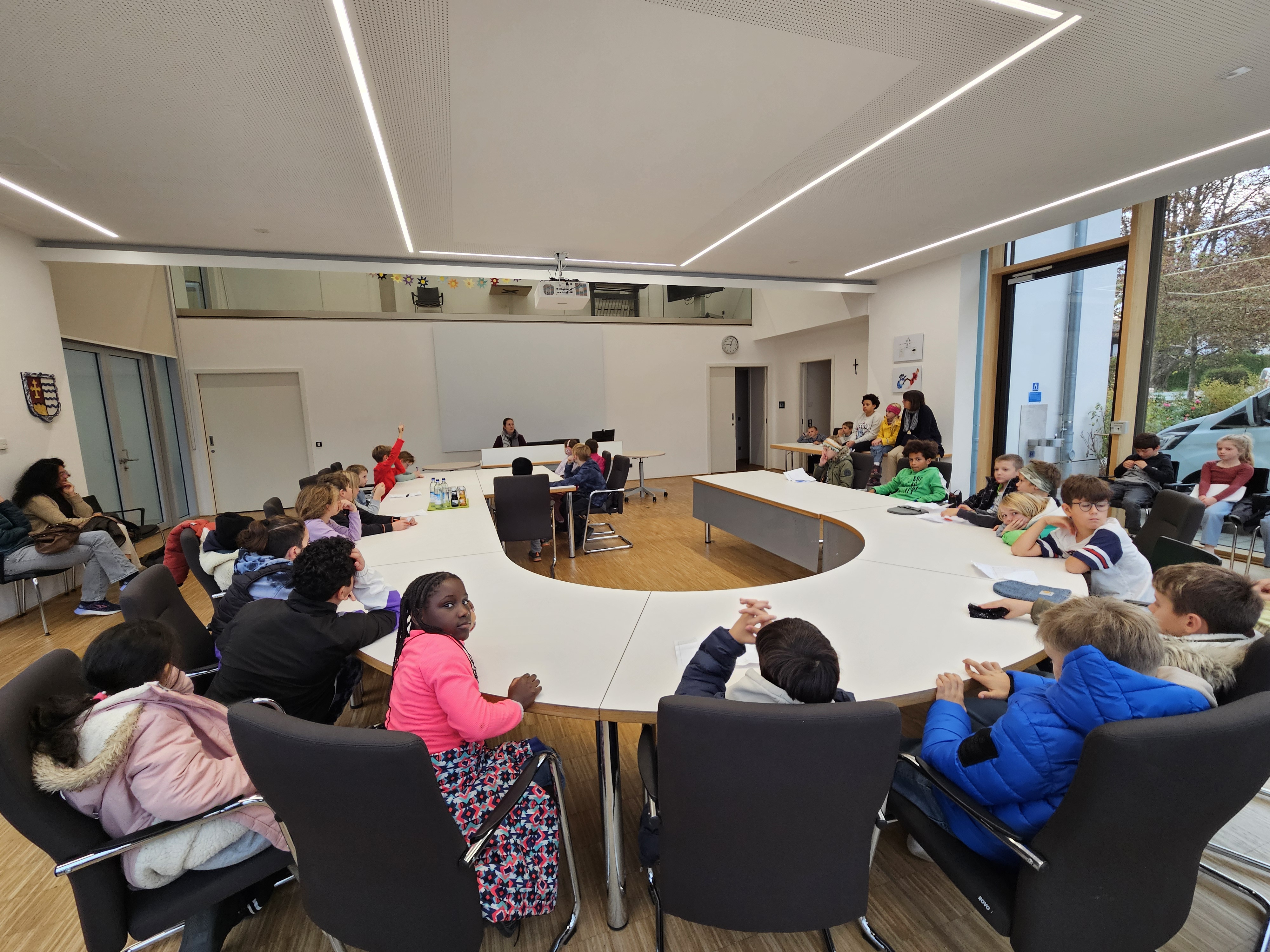 Wer am Donnerstag, den 23.10.2025, in den Sitzungssaal des Gemeinderates ins Rathaus spähte, entdeckte dort zwar die Bürgermeisterin, aber keinen der 20 Gemeinderäte Bernaus. Dafür saßen auf den Stühlen an diesem Morgen die Viertklässler der Grundschule Bernau, ihre Stifte gezückt und eine Vielzahl an Fragen dabei, mit ihren Lehrerinnen.