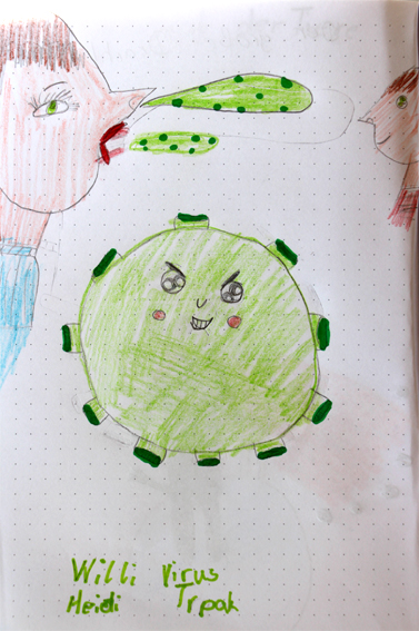 In diesem Sachbilderbuch kommt auch Willis Cousine Cordula Corona aus China vor und so erfuhren die Schüler auf kindgerechte, aber auch informative Art: Was passiert da eigentlich im Körper? Was genau sind denn nun Fresszellen, Abwehrzellen und Gedächtniszellen und wie kann ich mich und andere vor einer Ansteckung schützen? Fragen, die in diesem Sachbilderbuch ebenso informativ wie kurzweilig beantwortet werden. Es bestand sehr viel Gesprächsbedarf bei den Kindern, bevor jeder in seinem Lesetagebuch eine Seite dazu gestaltete.